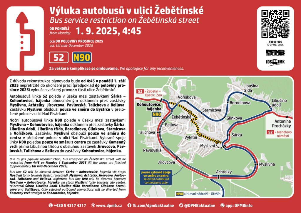 Podrobnosti o městské hromadné dopravě najdete zde: https://www.dpmb.cz/vyluka-autobusu-v-ulici-zebetinske