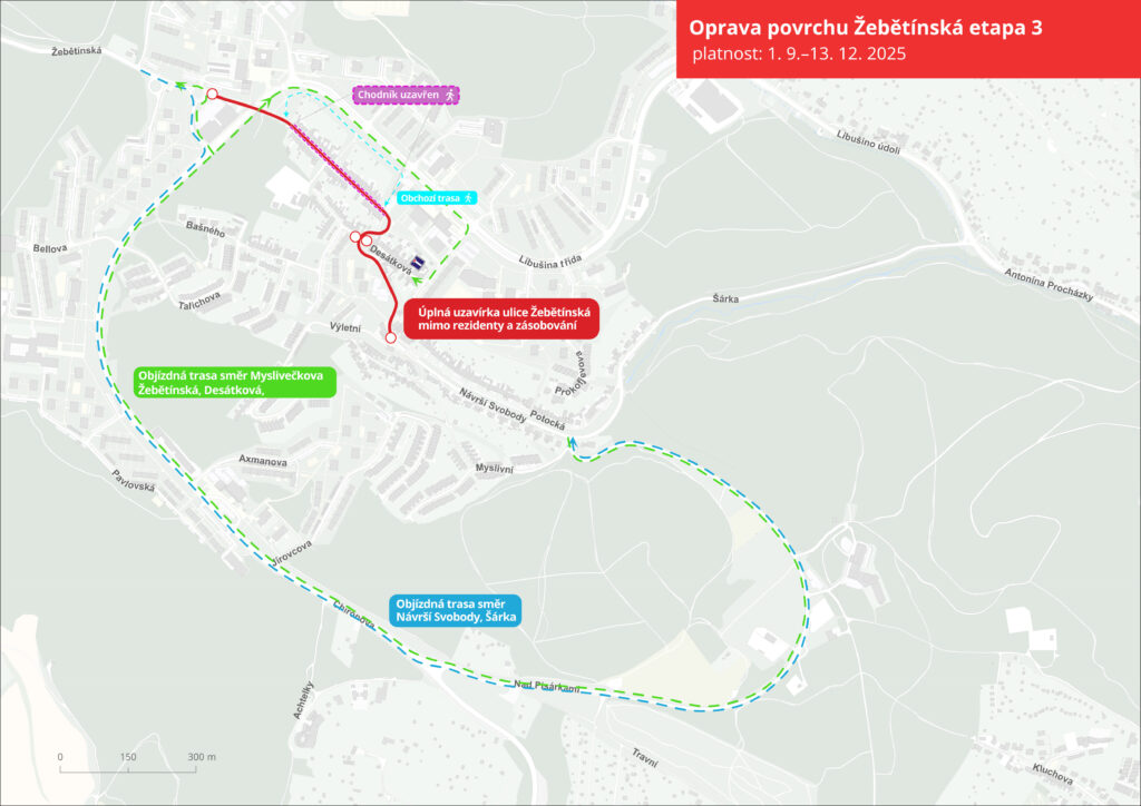 Od pondělí 1. září do 13. prosince si opravy na Žebětínské ulici v úseku (návrší Svobody – okružní křižovatka Libušina třída) vyžádají úplnou uzavírku komunikace a částečně i chodníků. Stavbaři v daném úseku opravují plynovod a následně povrchy silnice.