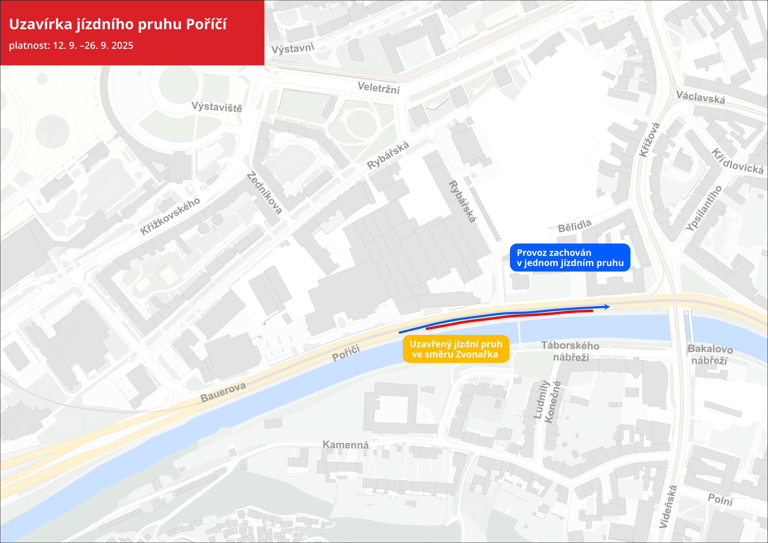 Řidiči se nemusí obávat, že by se nově opravená komunikace na Poříčí uzavírala. V blízkosti lávky Rybářská je nutné vydláždit chodník a dodělat další nutné práce, proto se v tomto úseku od 12. září po dobu nezbytně nutnou uzavře jeden pruh komunikace ve směru k Novým sadům. Auta pojedou v druhém pruhu.