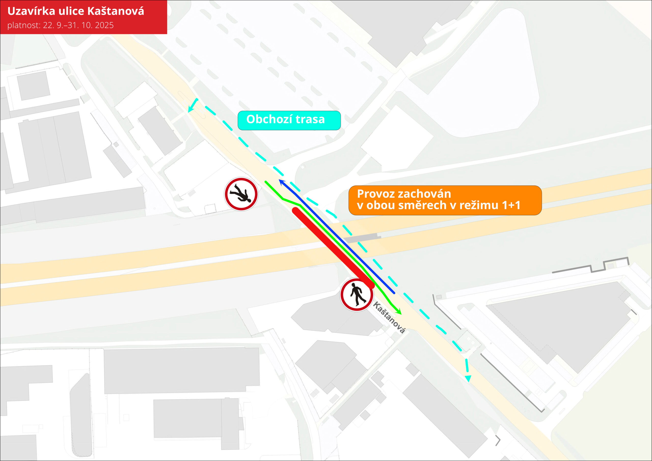 Na Kaštanové v úseku pod dálnicí D1 se bude od 22. 9. do 31. 10. 2025 překládat plynovod. Doprava zde bude řešena v režimu 1+1. Průchod chodců zůstane zachován.