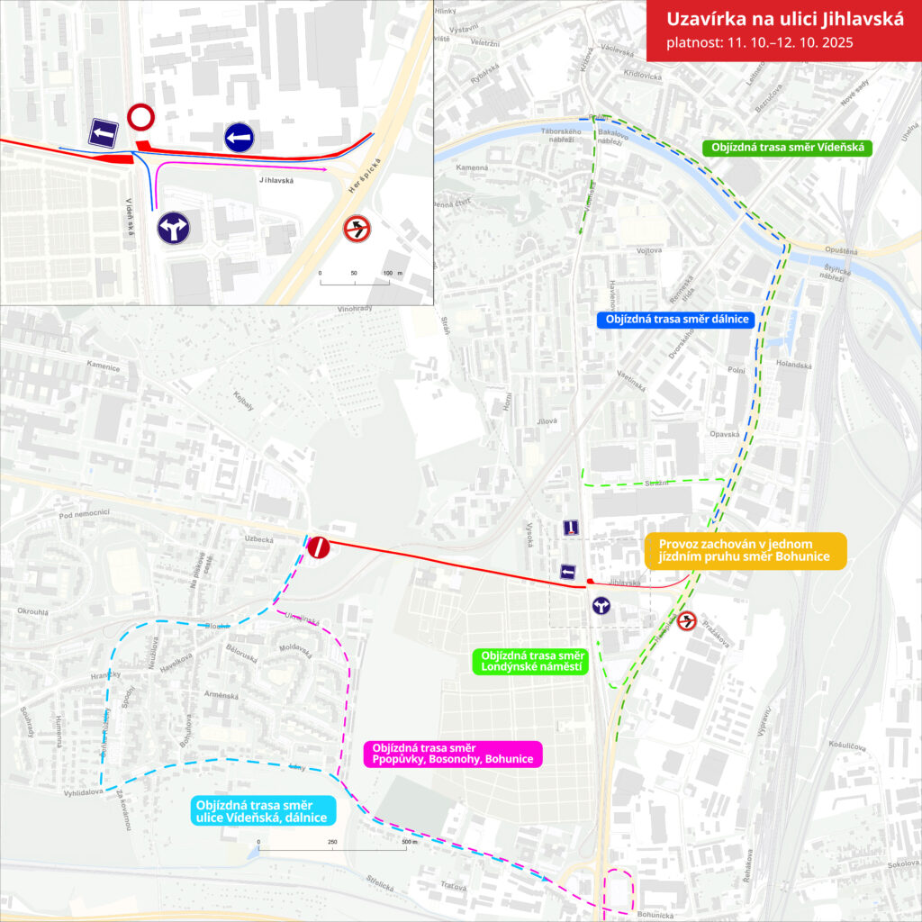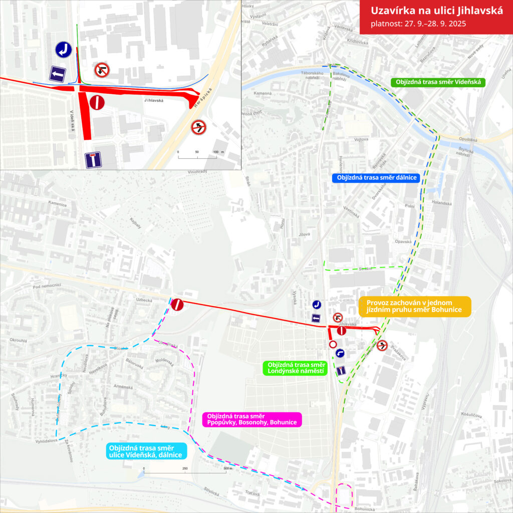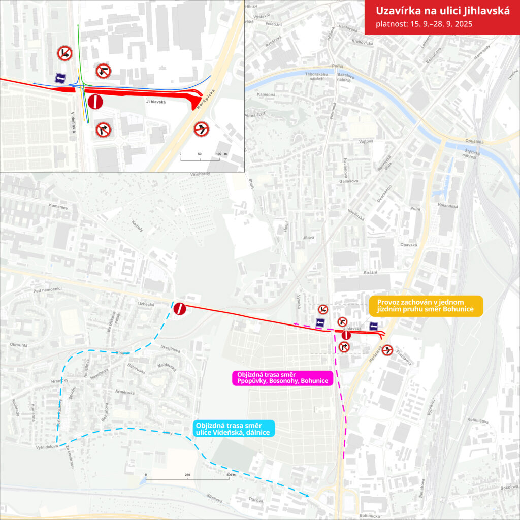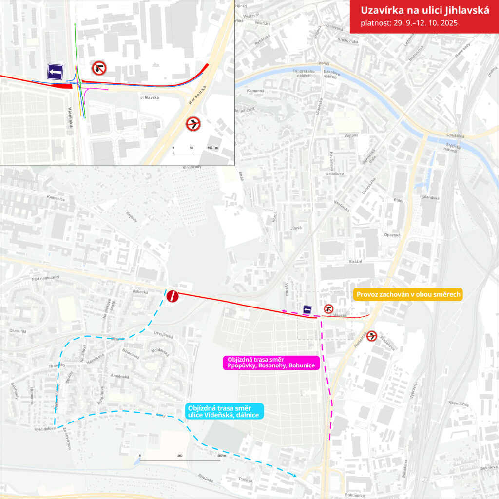 - Ulice Jihlavská mezi Vídeňskou a Heršpickou bude průjezdná pouze ve směru Ústřední hřbitov/Bohunice při odbočení vpravo z Heršpické od centra města.