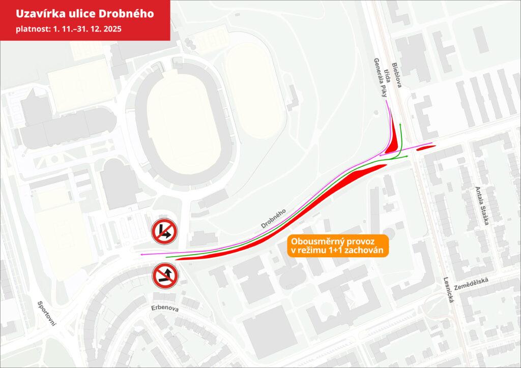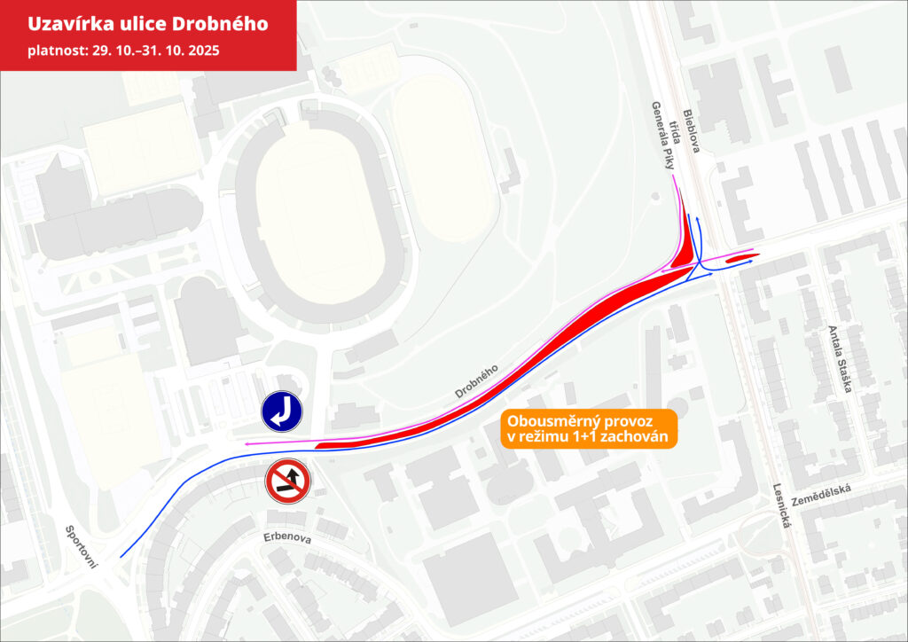 Rekonstrukce kanalizace a vodovodu v ulici Drobného proběhne v úseku od ulice Erbenovy přes křižovatku s ulicí Sportovní a Pionýrskou po třídu Generála Píky. Stavbaři začnou 29. října 2025 a práce potrvají rok.