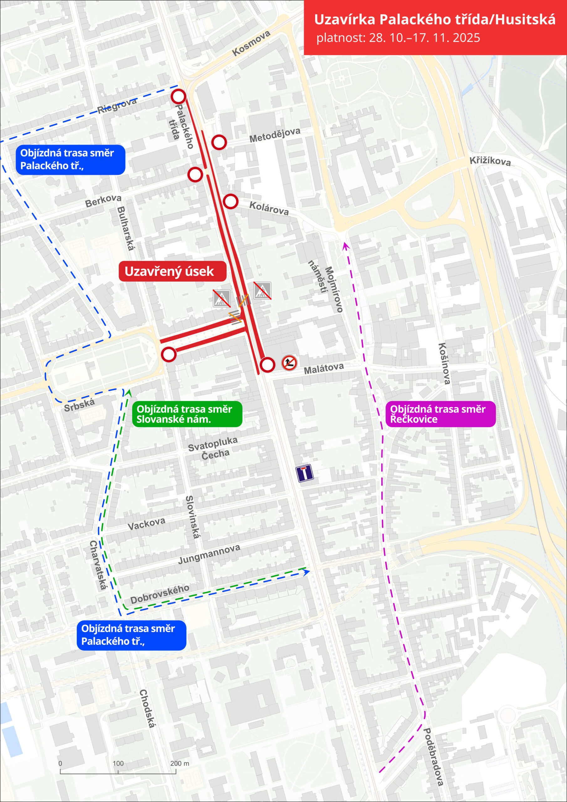 - Pracovat se bude v úseku Slovinská – Palackého třída. Zde bude ulice zcela uzavřena v obou směrech.