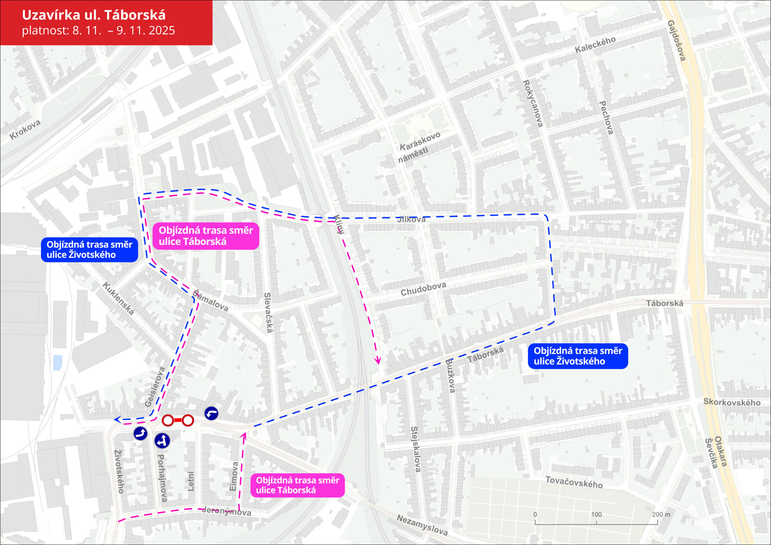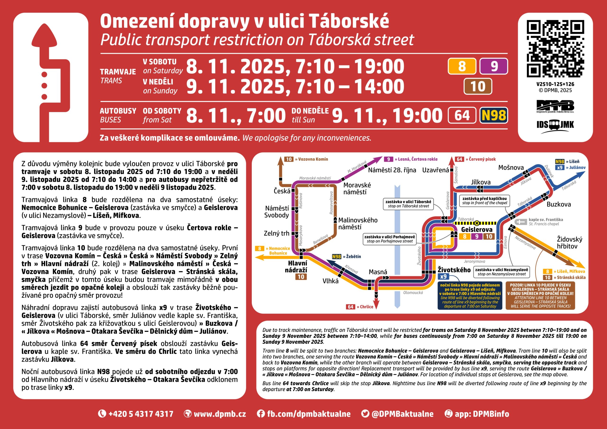 Více informací k MHD najdete zde: https://www.dpmb.cz/vyluka-v-ulici-taborske