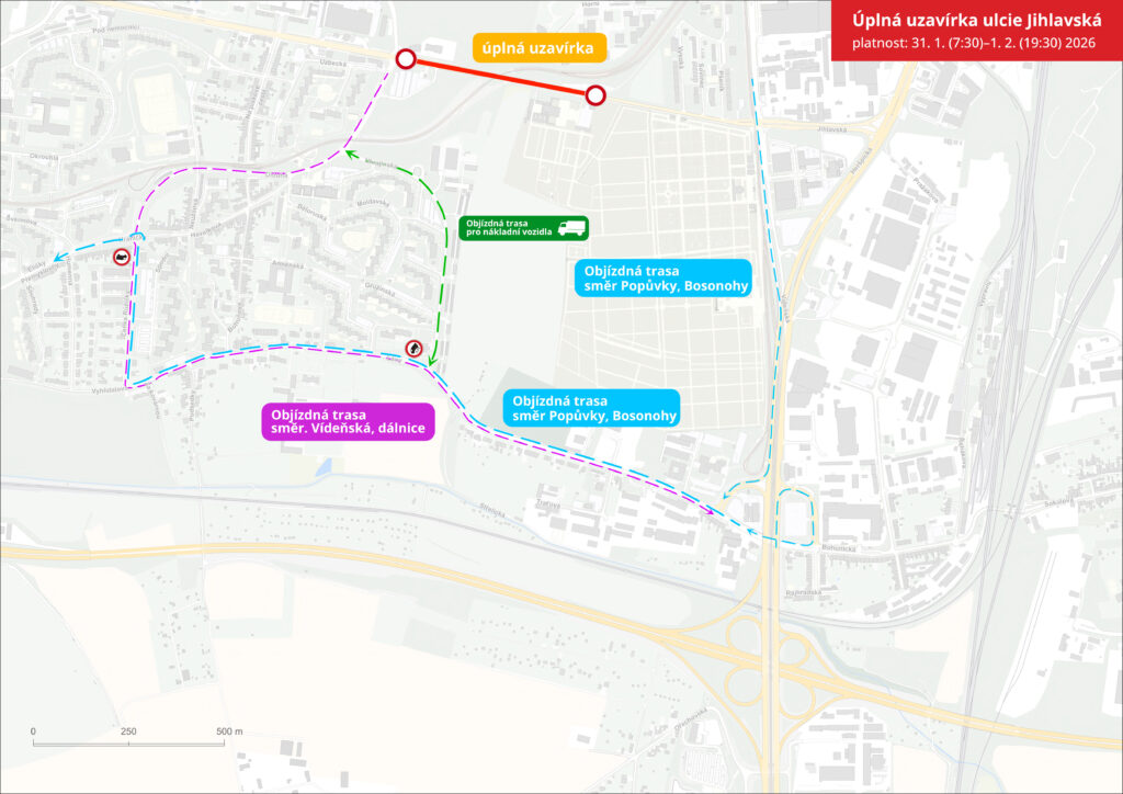 - Objízdná trasa ve směru na Vídeňskou ulici vedou přes Dlouhou a Lány, ve směru Popůvky a Bosonohy využijte Vídeňskou, Lány a Čeňka Růžičky.
